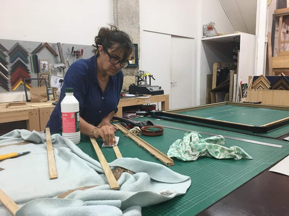 Carmilla, encadreuse d’art, ponce un grand cadre en bois. Elle est membre du makerspace depuis son ouverture : “Normalement, un encadreur travaille dans sa propre boutique, mais moi je ne voulais pas être seule. J’ai donc cherché un atelier partagé, parce que c’est une ambiance particulière. Ici, on travaille tous ensemble et il y a un esprit de famille”.