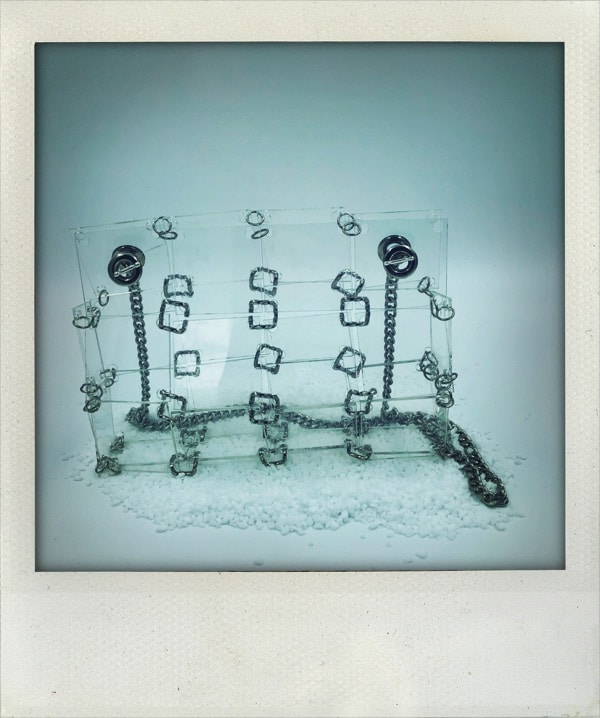 Rose aime le geste, elle aime recycler, transformer des matériaux de la vie quotidienne glanés dans les brocantes – plume, ciment, métal, plastique, résine, fils – et les charger de séduction et de précieux. “Ces matériaux sont emprunts d’une résonance : chacun porte sa propre histoire et un peu de l’histoire du monde, dans ses dimensions culturelles et naturelles.”