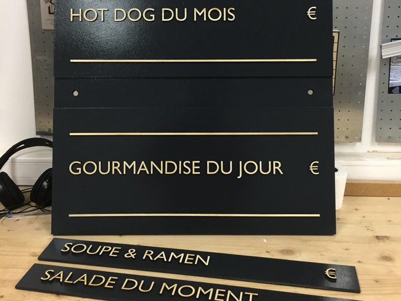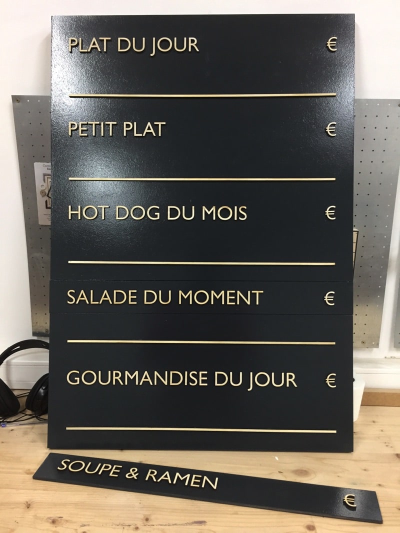 Conception et réalisation sur mesure de panneaux de menus effaçables, réutilisables et modulables pour l’inscription de la carte et plats du jour dans les restaurants SPOK.