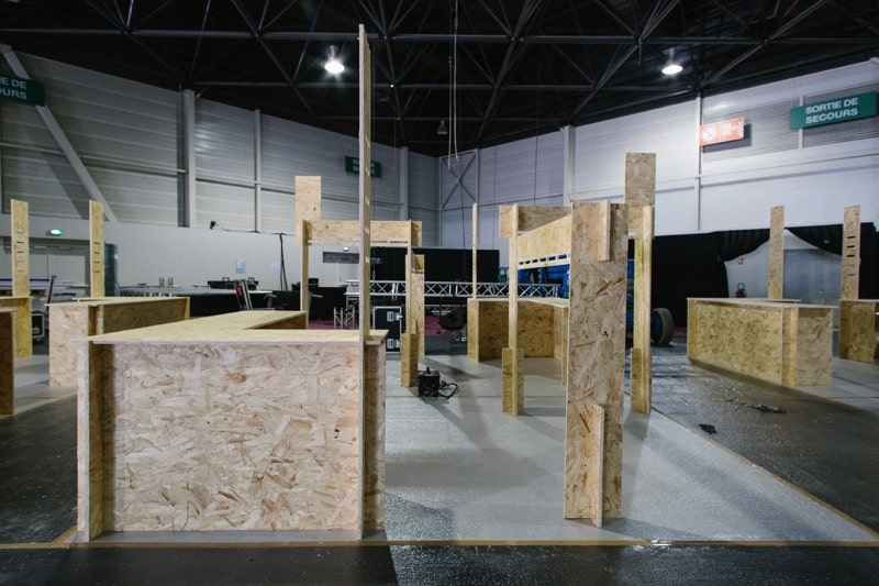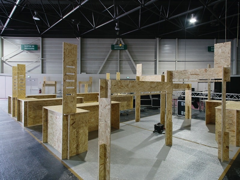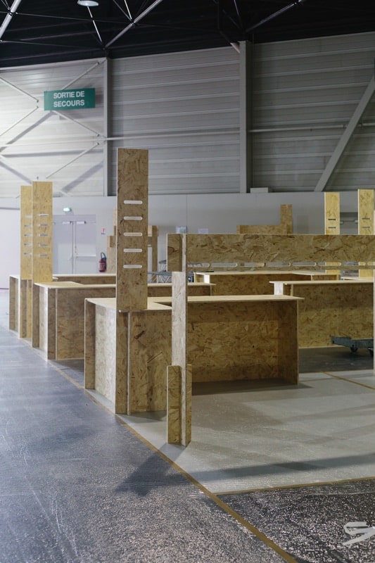 Création de l’espace créateurs : corners auto-portant composé de banques et 12 portants de 1,50m de long par 2,40m de haut
