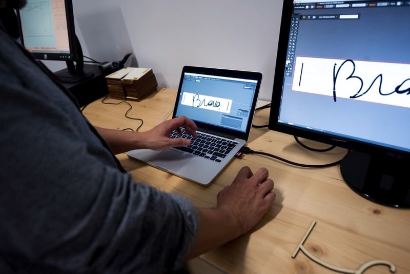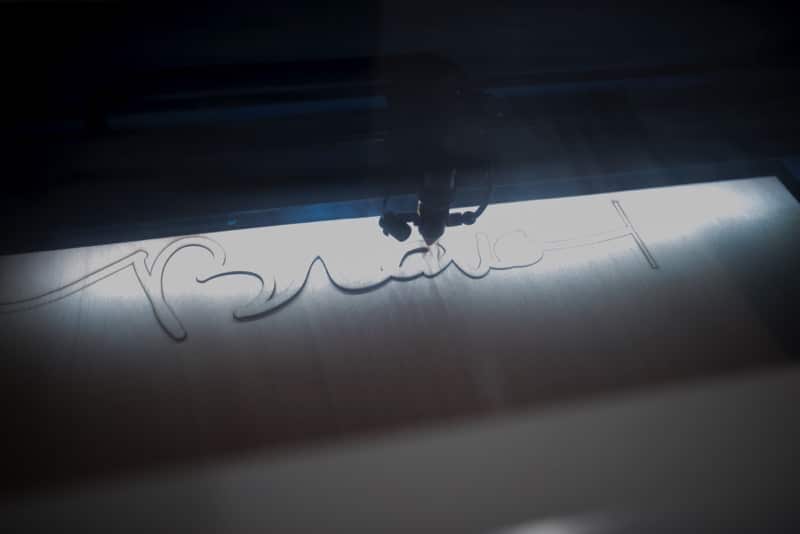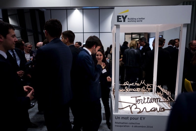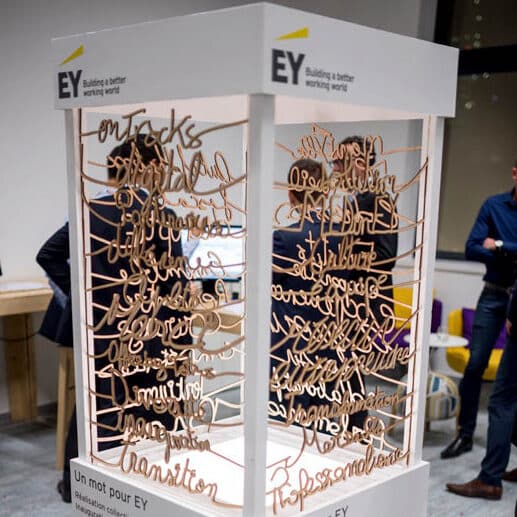 Pendant cet atelier, les invités ont pu écrire une intention, un mot pour EY. Chaque mot a été numérisé puis gravé à la laser, puis déposé sur un socle au fur et à mesure de la soirée. Totem qui a pu être exposé à l’accueil des bureaux par la suite.